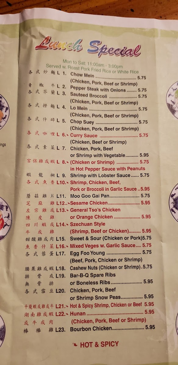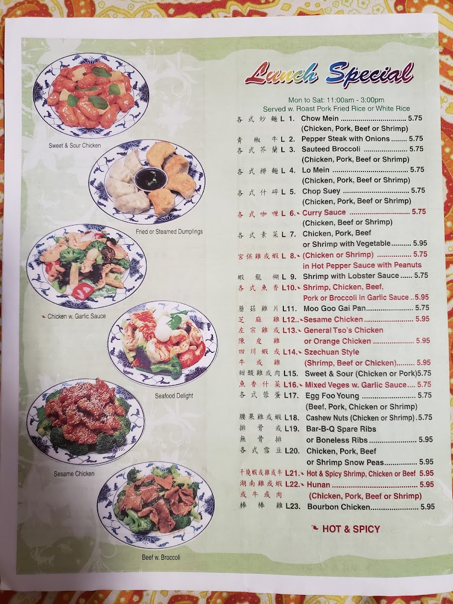 You’ll find a balance of hearty and savory options like Chow Mein, Pepper Steak with Onions, and BarBQ Spare Ribs alongside lighter, vegetable-focused dishes such as Sautéed Broccoli and Mixed Veges with Garlic Sauce. The menu also offers popular favorites with a little kick, including Szechuan Style and General Tso’s Chicken, which bring a subtle warmth to the overall experience.